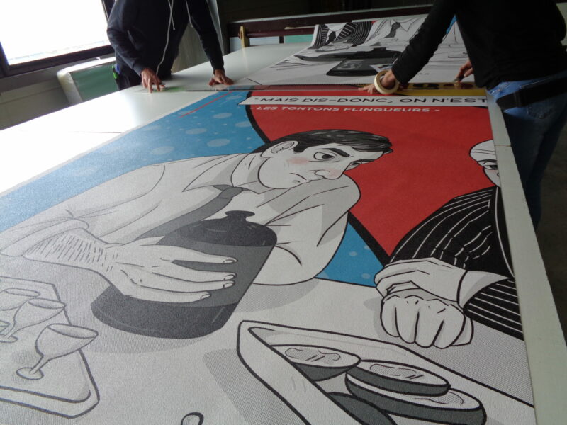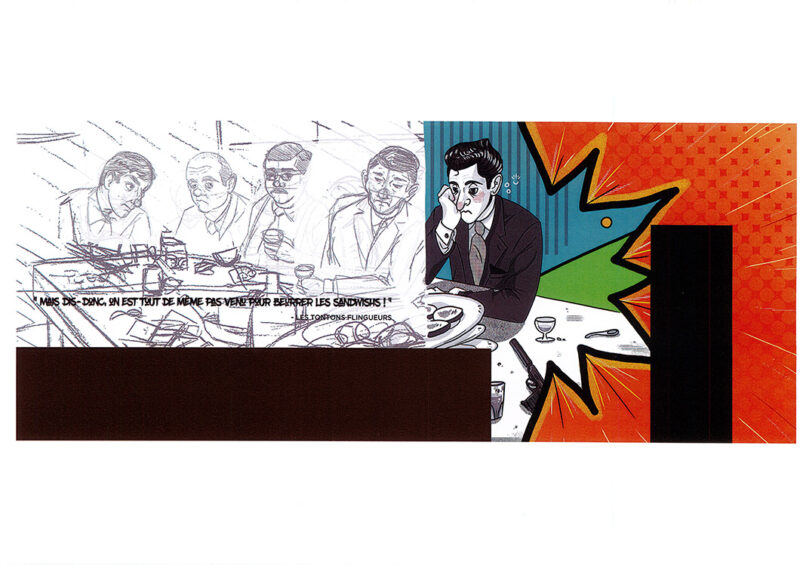 La scène choisie est celle de la cuisine dans le film « Les Tontons Flingueurs » de Georges Lautner. La séquence a entièrement été redessinée aux crayons puis retravaillée à la palette graphique. Une fois colorisé, le rendu est résolument fun et pop !