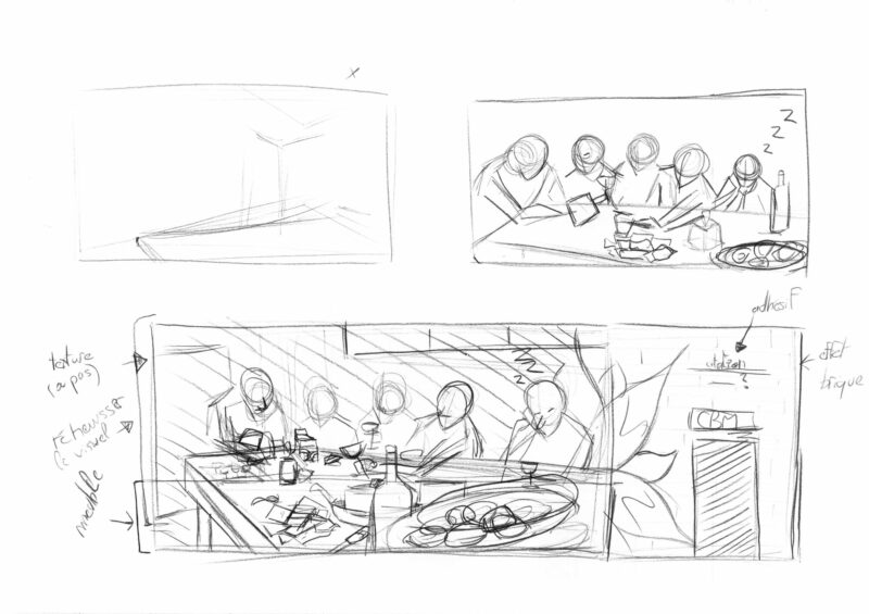 Voici un défi de taille pour l’ensemble de notre studio graphique ! Pour ce faire, plusieurs pistes ont été abordées avant de s’orienter sur un thème : une scène de cuisine culte de la culture populaire, validée par le client.