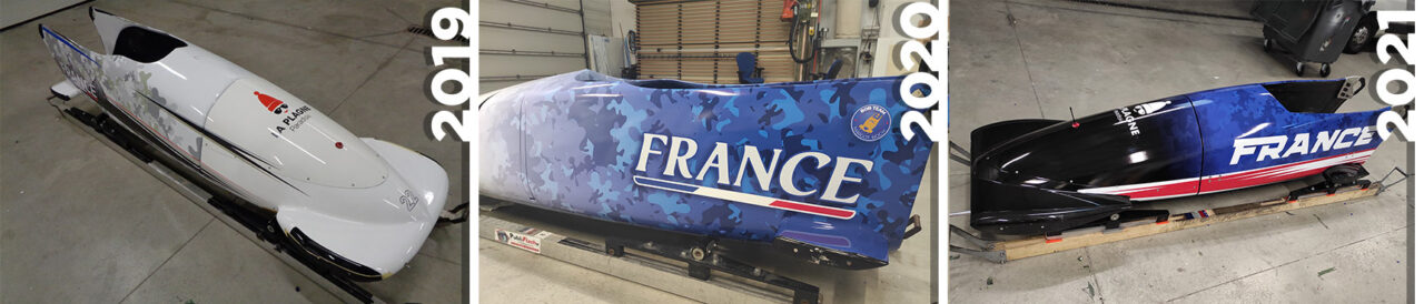 Voyant leur détermination et leur esprit de battantes, nous avons naturellement accepté de les soutenir et de devenir partenaire de leur réussite. Nous avons choisi de les accompagner à notre manière en habillant le bob de la team Boch au fil des saisons. Nous avons d’abord créé un logo pour l’équipe. Ensuite, nous avons appliqué les premières nuances de camouflage sur le bob, en référence aux tenues des Chasseurs Alpins. Le jour où elles se sont qualifiées pour les Jeux Olympiques, nous avons repensé le covering du bobsleigh pour représenter la nation dans l’esprit des JO. Bien évidemment, celui-ci s’est revêtu d’un beau bleu patriote affichant fièrement le mot « France ». Le motif camouflage est restée chez les filles.