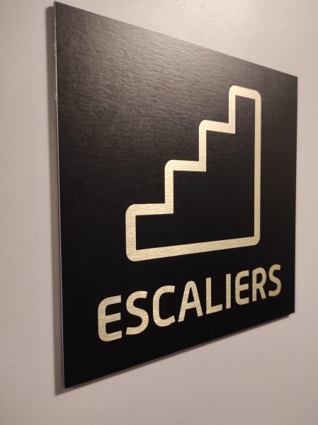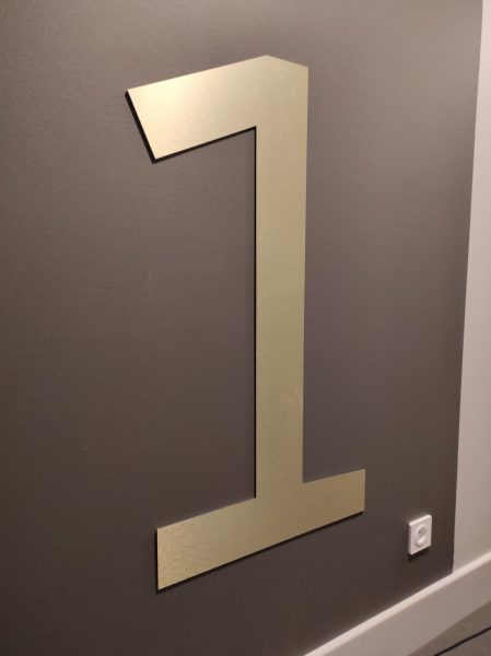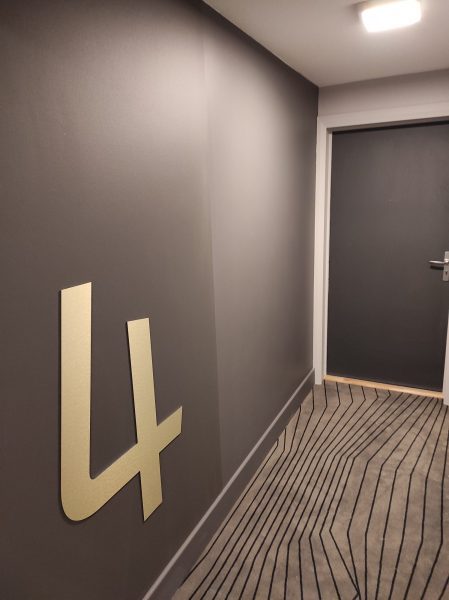 Enseigne intérieure d’entée de résidence, plaques signalétiques sur les espaces communs de l’immeuble, et gros numéros coupés à la forme dans les étages