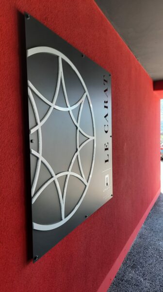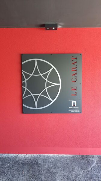Une signalétique sur-mesure pour l’immeuble “Le Carat” à Albertville de notre client Armanet & Associé, promoteur immobilier. Tôles et plexiglas découpés à la forme, adhésif teinté pleine masse…