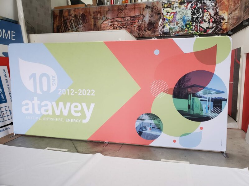La société Atawey, située à Savoie Technolac a fait le choix d’un mur d’image de 600×230 avec une impression recto/verso différente afin de réaliser un fond de scène pour célébrer les 10 ans de la société.