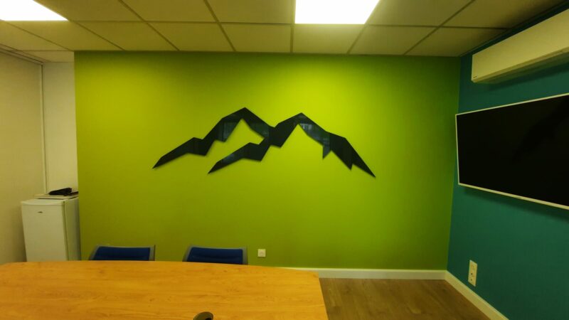 À l’intérieur, nous avons installé un logo en relief ainsi que des panneaux dibond laqués, découpés à la forme du logo client pour habiller la salle de réunion.