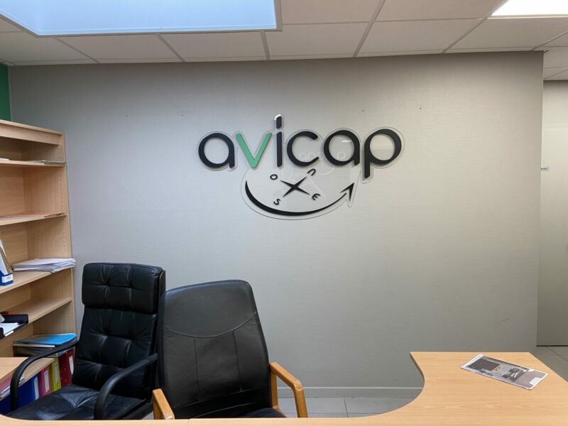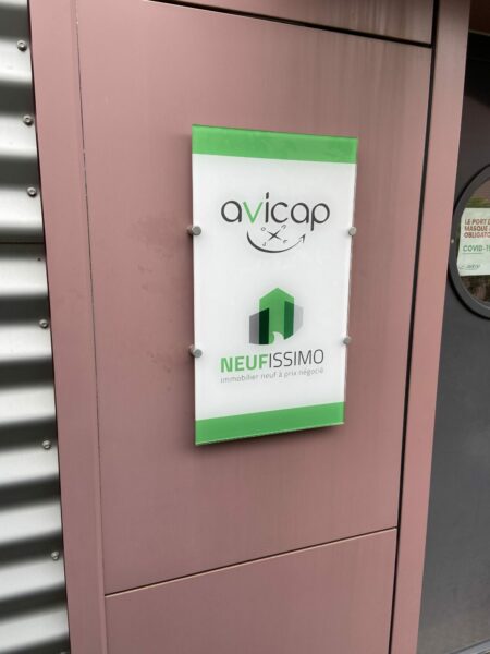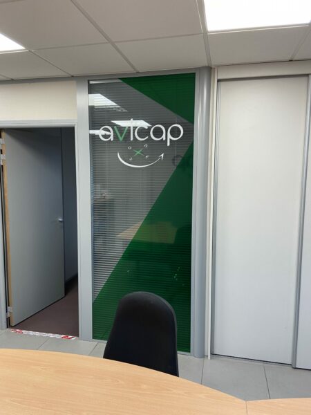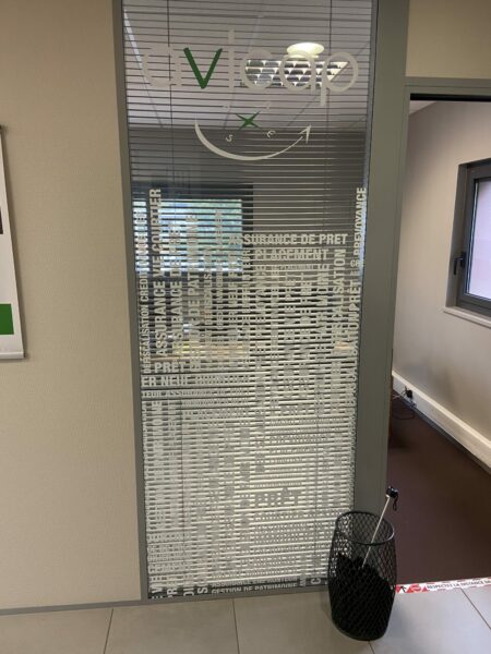 Une enseigne intérieure en PVC avec semelle Plexiglas, des panneaux et un habillage d’angle en Dibond… Des vitrophanies avec adhésifs translucides, blancs, en impression numérique ou a effet dépoli viennent habiller les différents bureaux de l’agence.