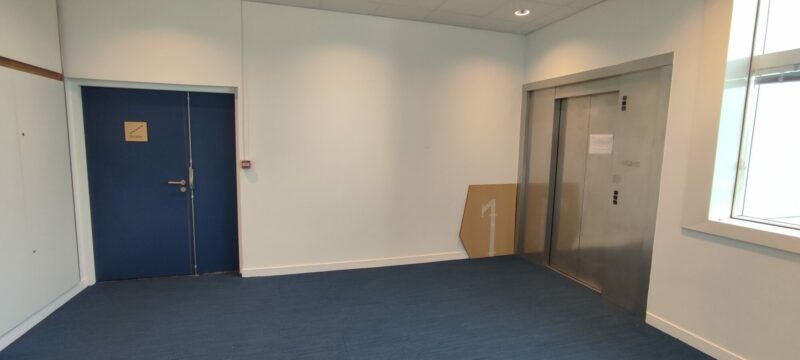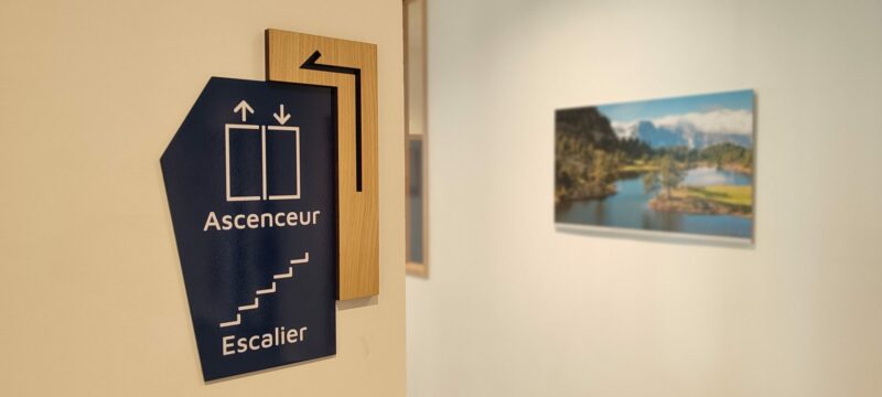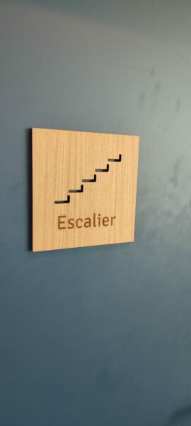 À l’intérieur, nous avons combiné du bois découpé au laser et du dibond laqué. Ces plaques habillent portes et ascenseurs en fournissant toutes les informations utiles.