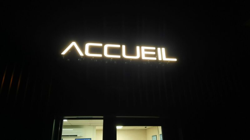 Parmi elles, une enseigne de 8 mètres de long représentait un véritable défi technique. L’objectif était d’obtenir un rendu sans fixation apparente. Pour y parvenir, nous avons suivi un processus précis : rendez-vous client, suivi technique, prise de côte, photos, validation de la faisabilité et pose.