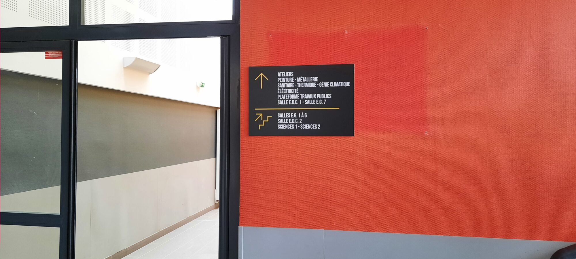 Nous avons collaboré avec Effet Boomerang sur un projet global de signalétique pour le BTP CFA des Savoie. L’objectif : créer un environnement plus accueillant et fonctionnel pour les élèves, à l’intérieur comme à l’extérieur.