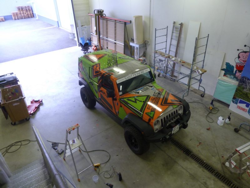 Voilà des challenges comme on les aimes! Cette Jeep a subi un total covering aux couleurs de l’entreprise de son propriétaire.