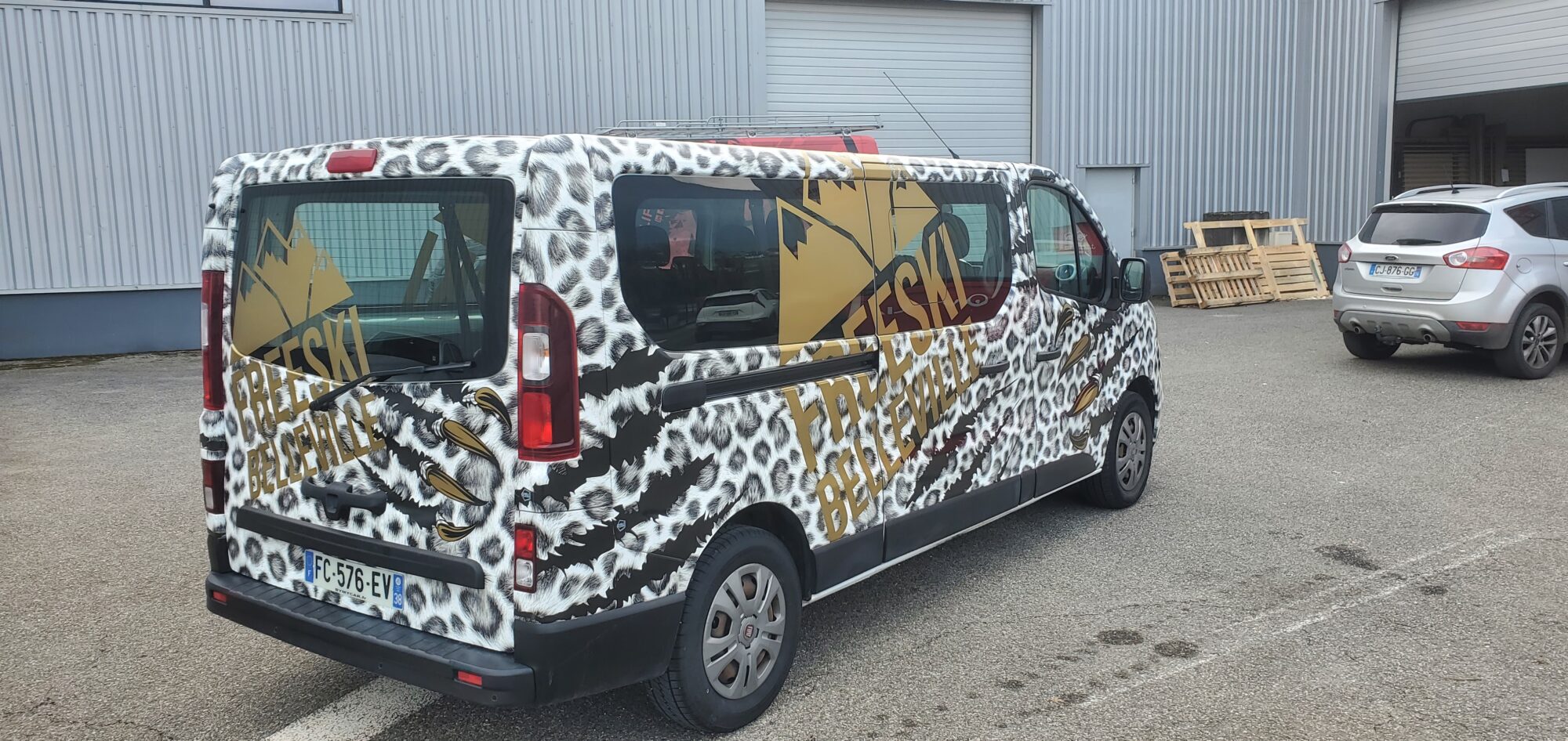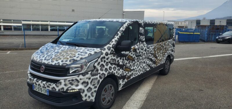 Résultat : un total covering façon panthère des neiges, avec un motif blanc, félin et dynamique. Le logo effet or vient renforcer l’identité et l’élégance du véhicule.