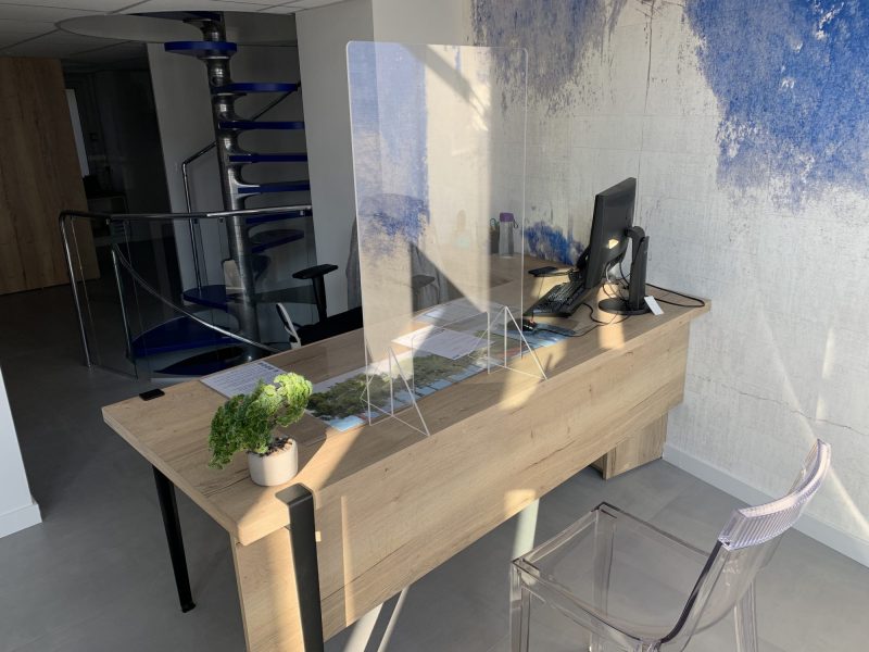 Hygiaphone en plexiglass pour assurer la séparation des interlocuteurs dans ce cabinet d’assurance.