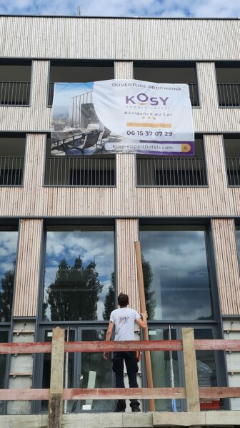 Nous avons aussi posé une bâche grand format pour renforcer encore la visibilité du lieu.