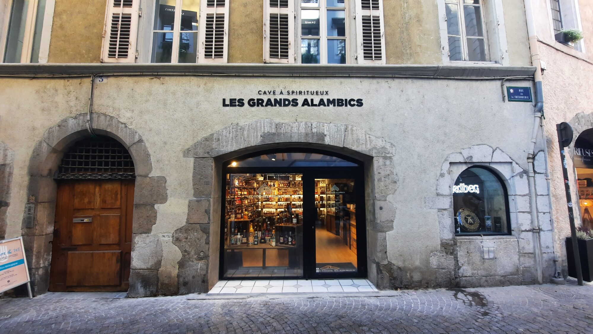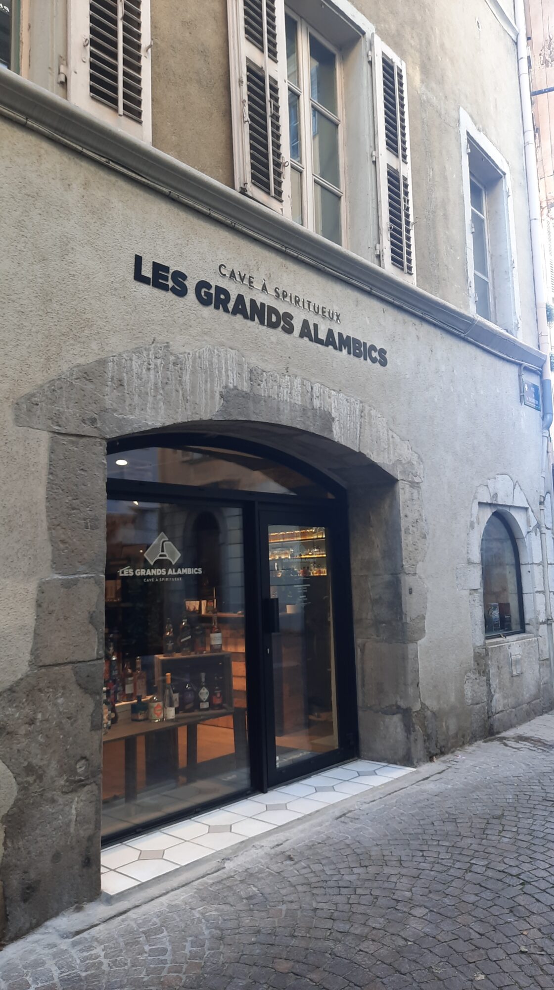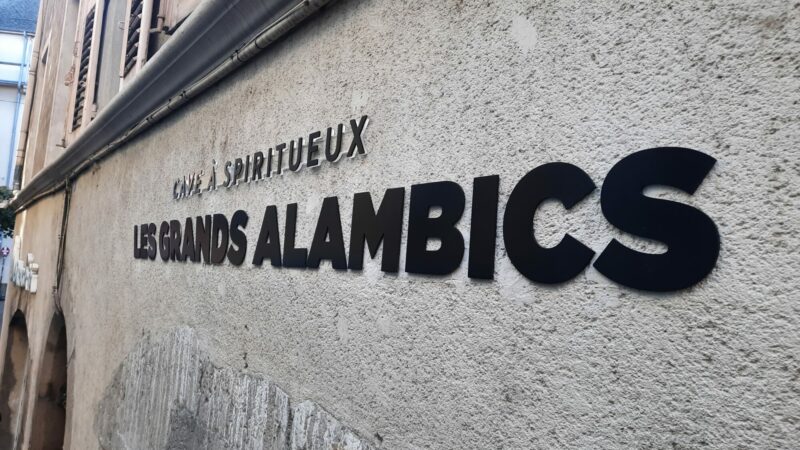Pour Les Grands Alambiques, installés en centre-ville historique de Chambéry, nous avons conçu une enseigne sobre et élégante.