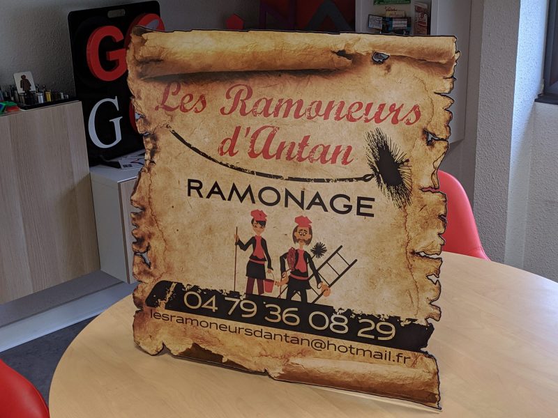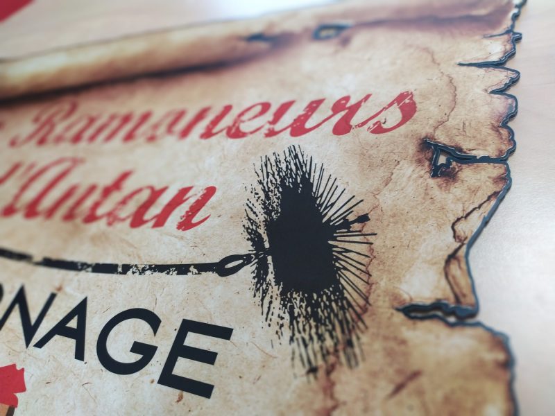 Un joli petit panneau découpé à la forme d’un parchemin, avec une impression numérique effet vieillie. On y croirait!
