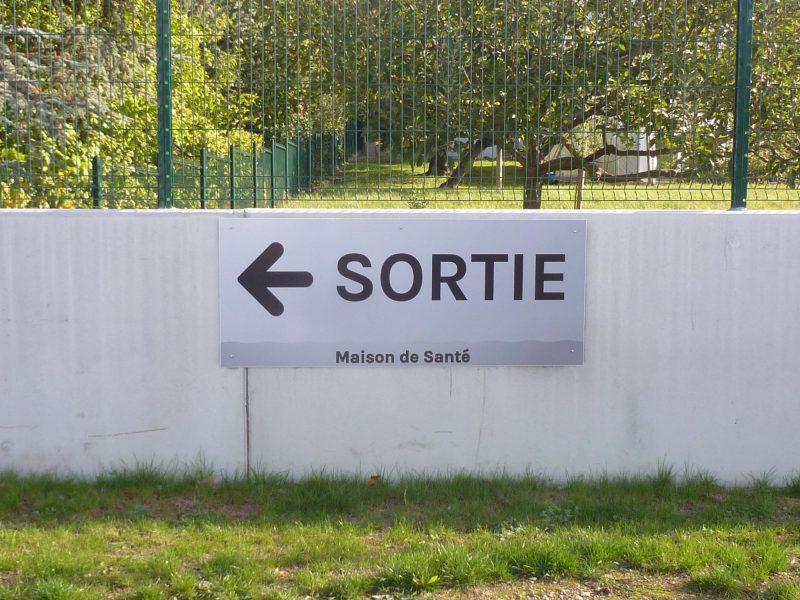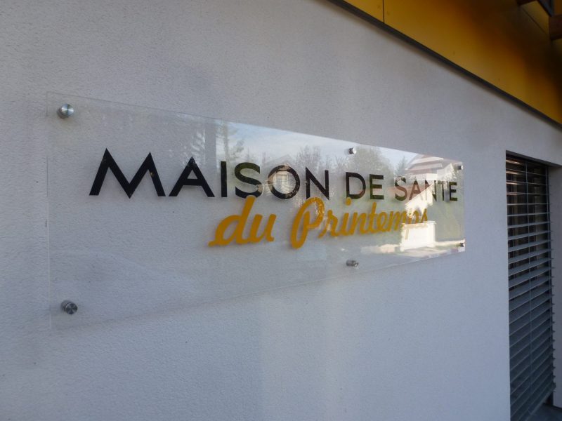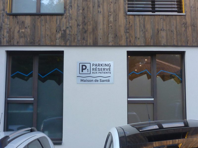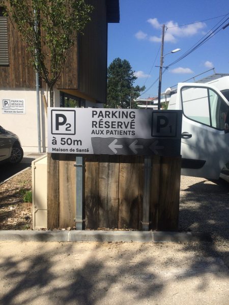 Plaque plexi à l’entrée de l’immeuble, panneaux alu sur les places de parking, panneaux directionnels et totem.