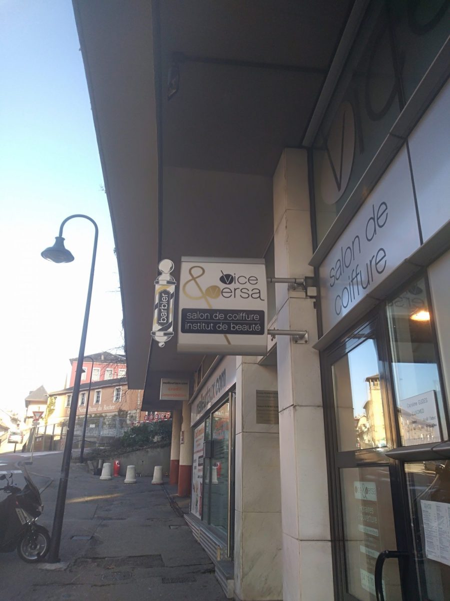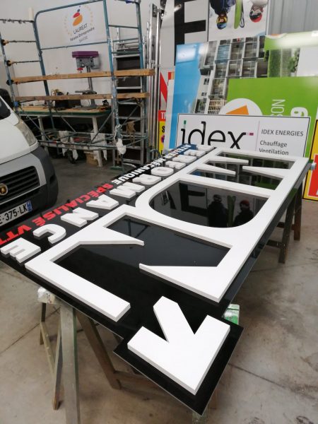 Enseigne en dibond et lettres PVC en relief découpées à la forme, pour donné du volume sur le bardage bois de cette façade.