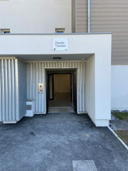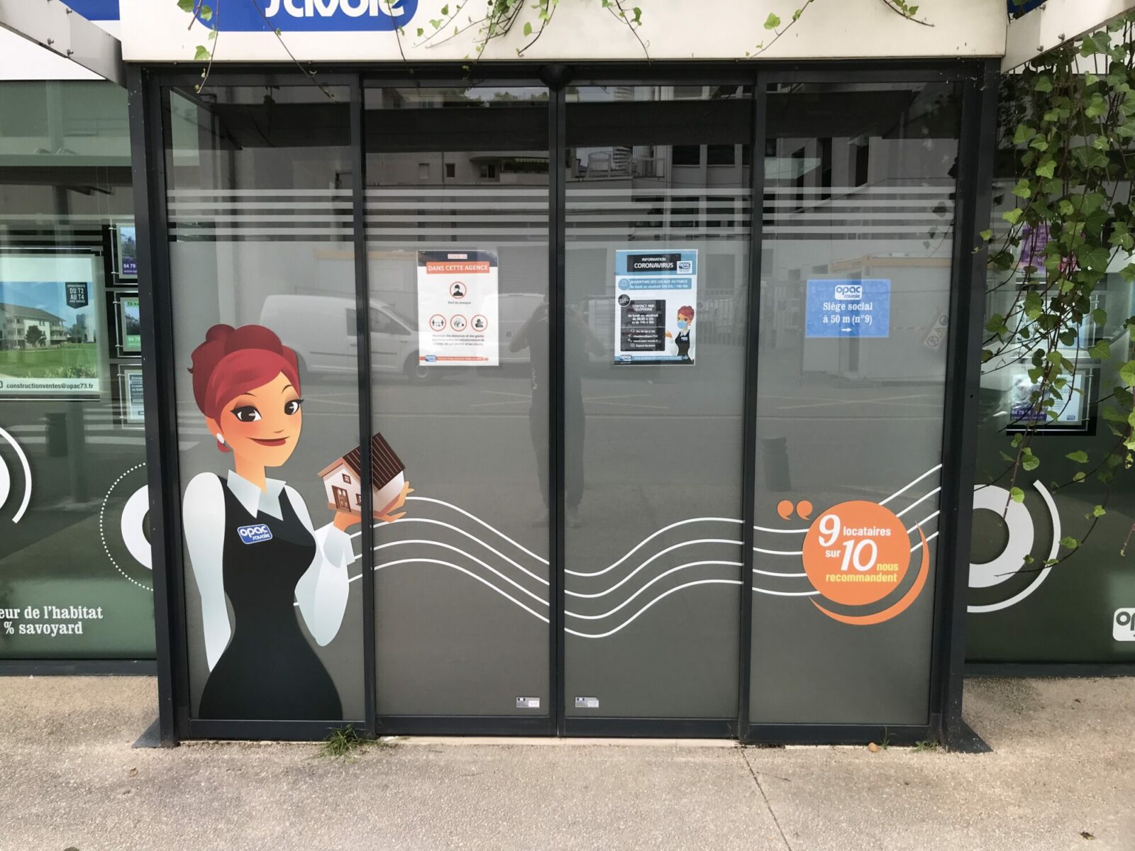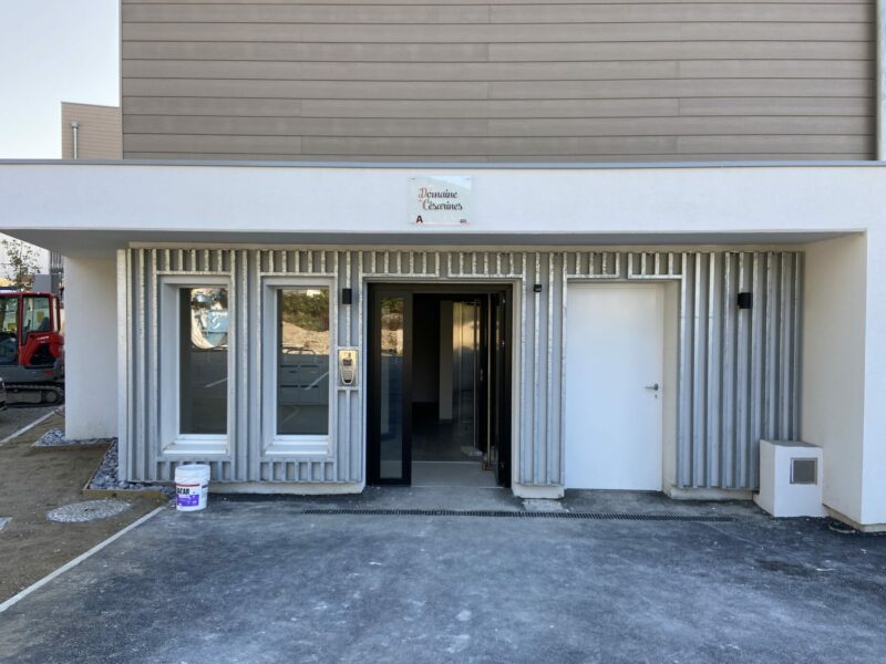 Des plaques d’immeubles personnalisées en verre trempé pour signaler les accès aux nouveaux bâtiments “Les Césarines” de l’OPAC de la Savoie. Pose sur site à Challes-Les-Eaux.