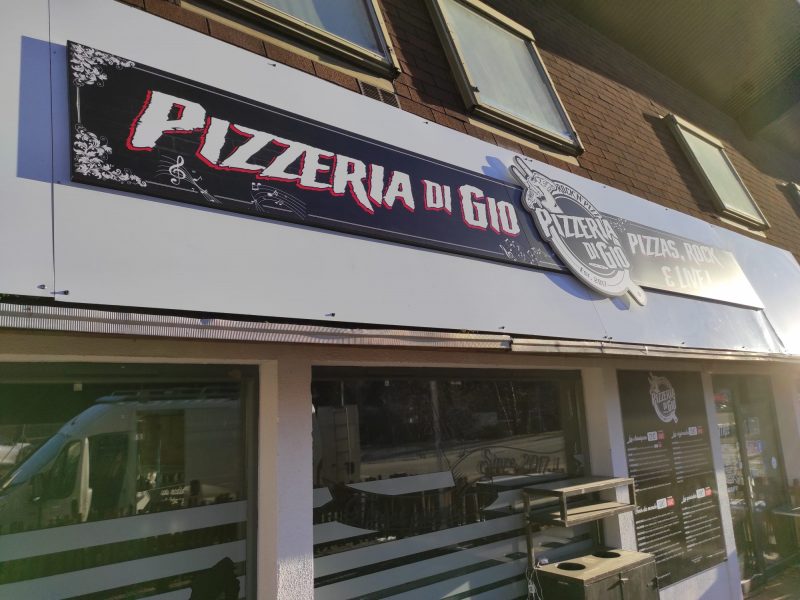 Enseigne alu plié et logo découpé à la forme en superposition pour ce client fidèle qui nous renouvelle sa confiance. Merci Pizzeria Di Gio!
