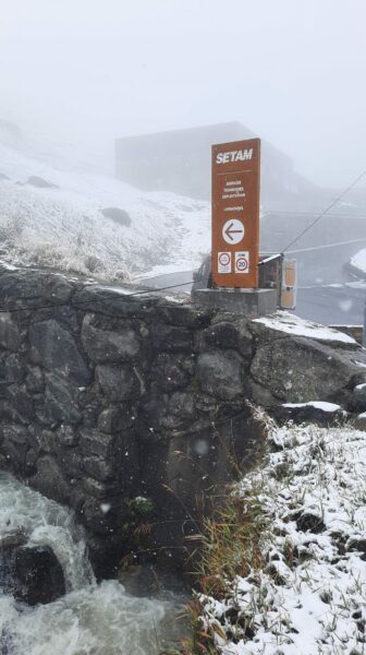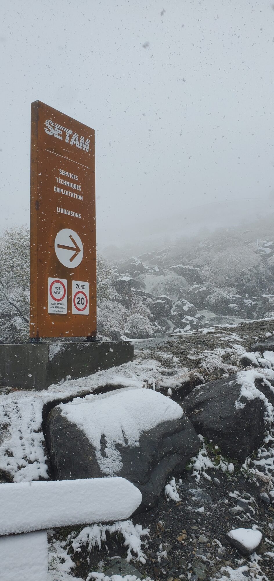 Nous avons donc réalisé un totem en acier Corten sur mesure. La pose s’est déroulée dans des conditions extrêmes, en pleine neige, ce qui a ajouté un vrai défi technique.