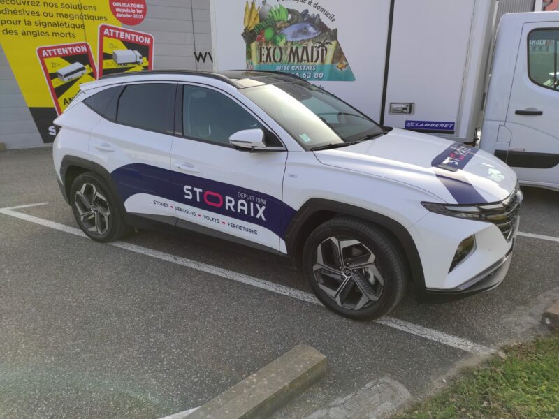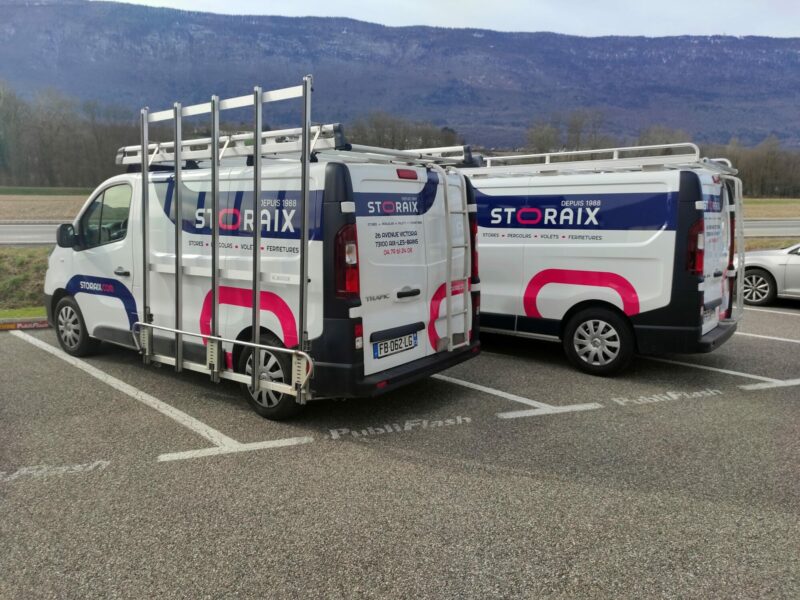 Adhésif avec impression numérique spécial covering, détouré à la forme pour une série de plusieurs véhicules de l’enseigne StorAix.