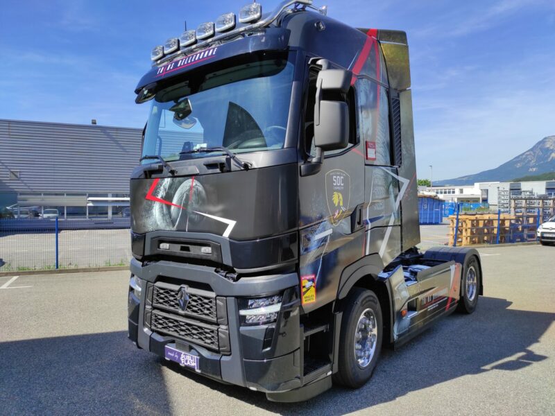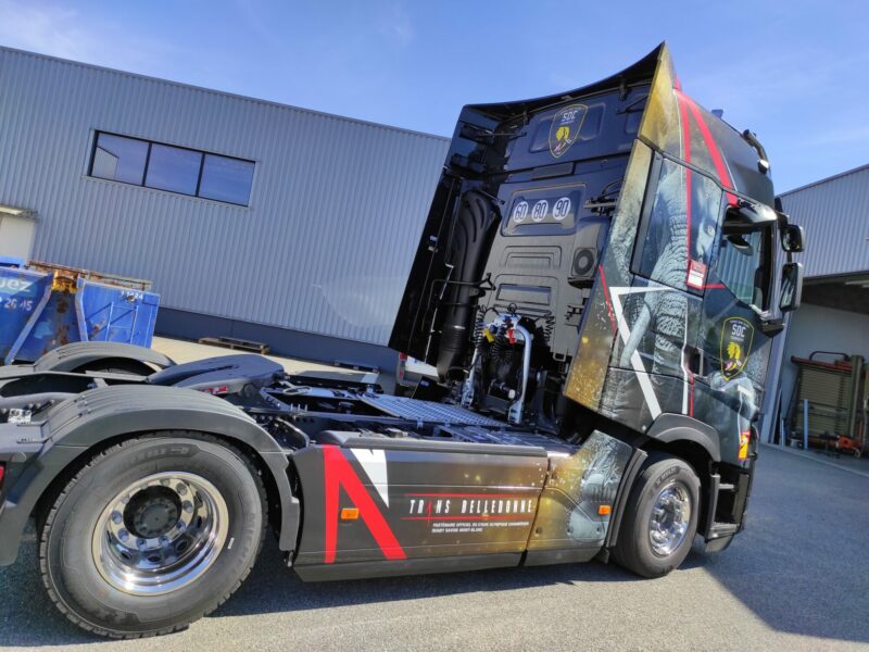 Client fidèle, la société TransBelledonne a souhaité faire un clin d’oeil à l’occasion de leur partenariat avec le SOC Rugby de Chambéry en nous confiant la réalisation de ce total covering sur un tracteur Renault T-HIGH.