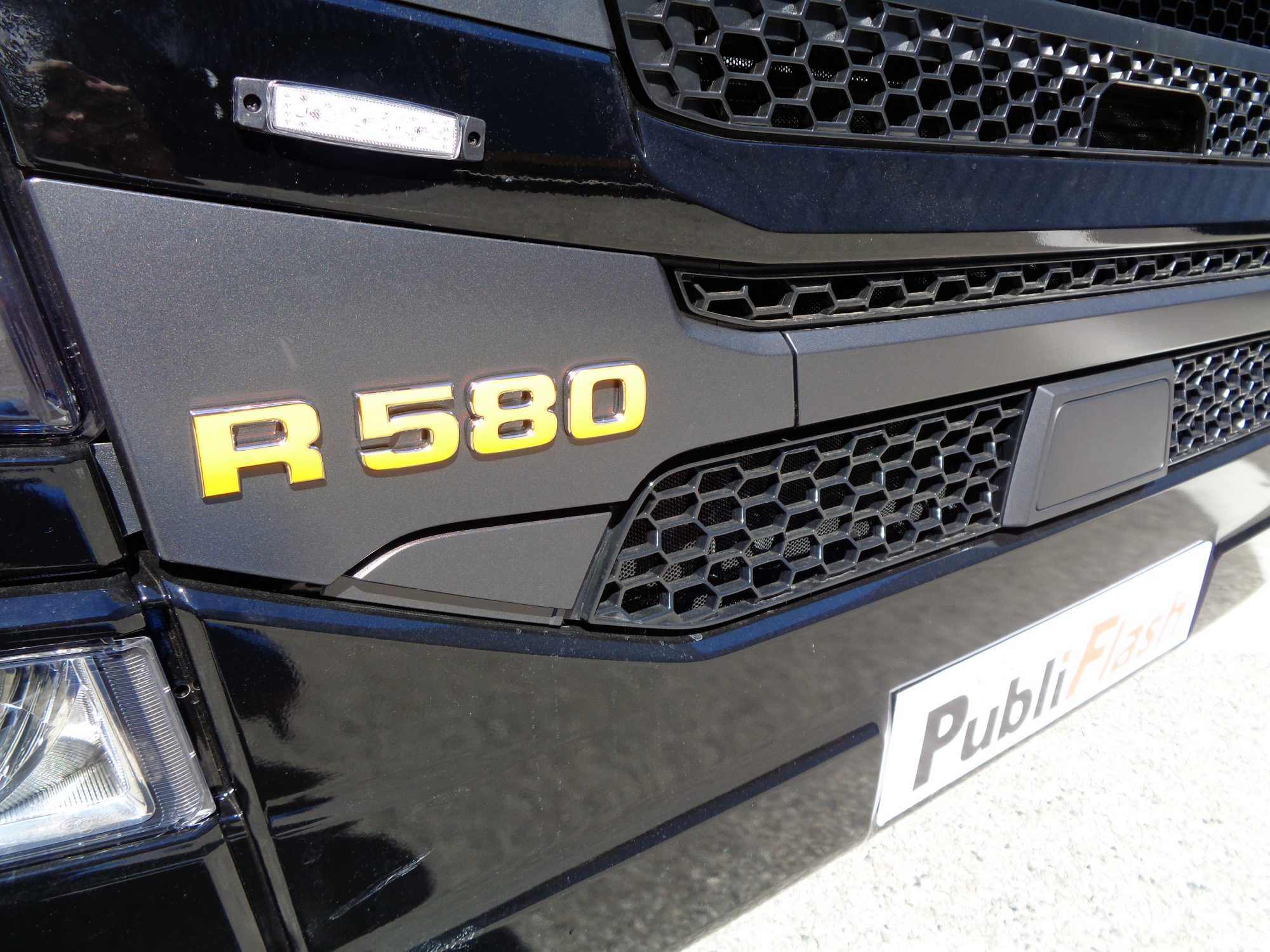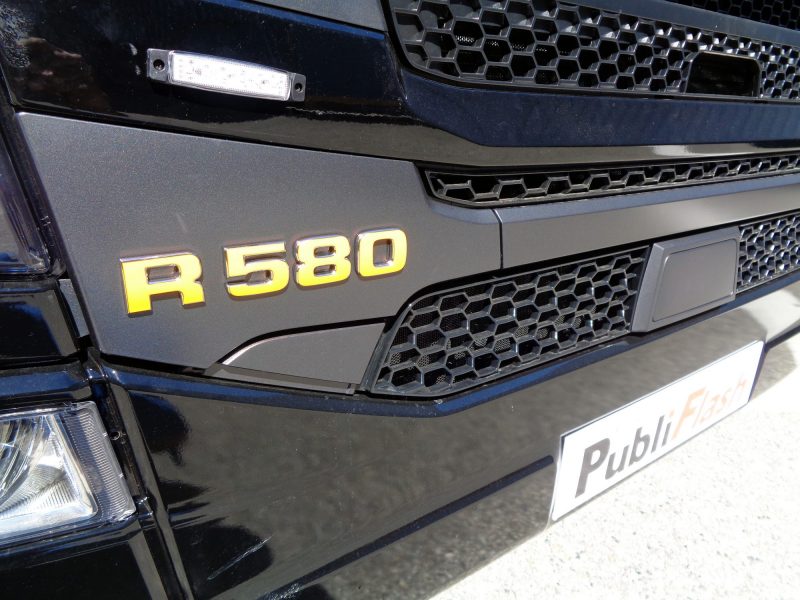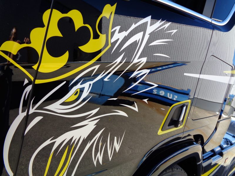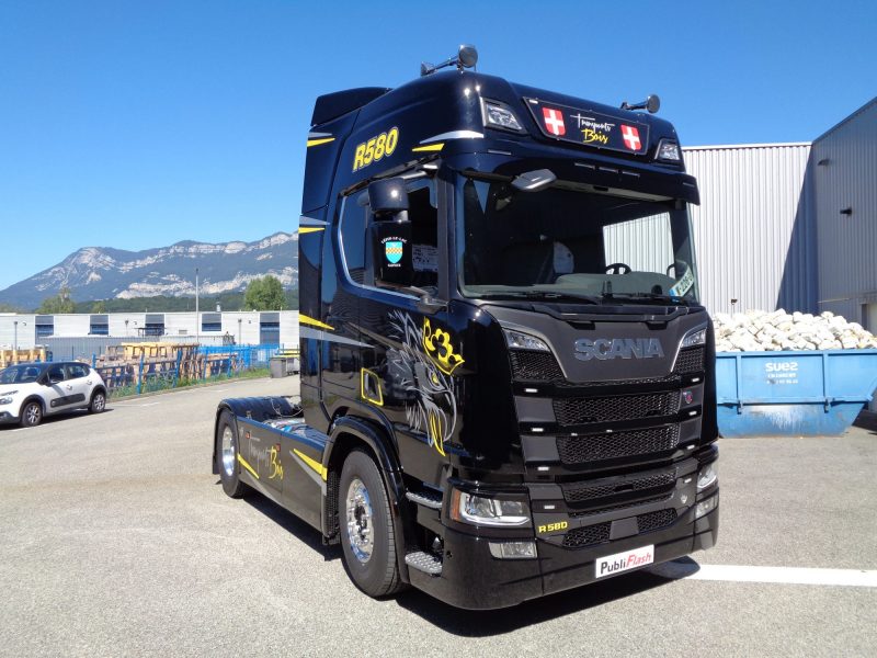 Encore une belle bête pour les Transports Bois. Scania personnalisé dans les moindres détails, contours de poignées, chiffres à l’avant…