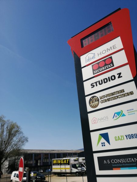 Totem avec affichage numérique de température et heure. Toutes les lattes sont lumineuses pour que les entreprises soient visibles même de nuit.