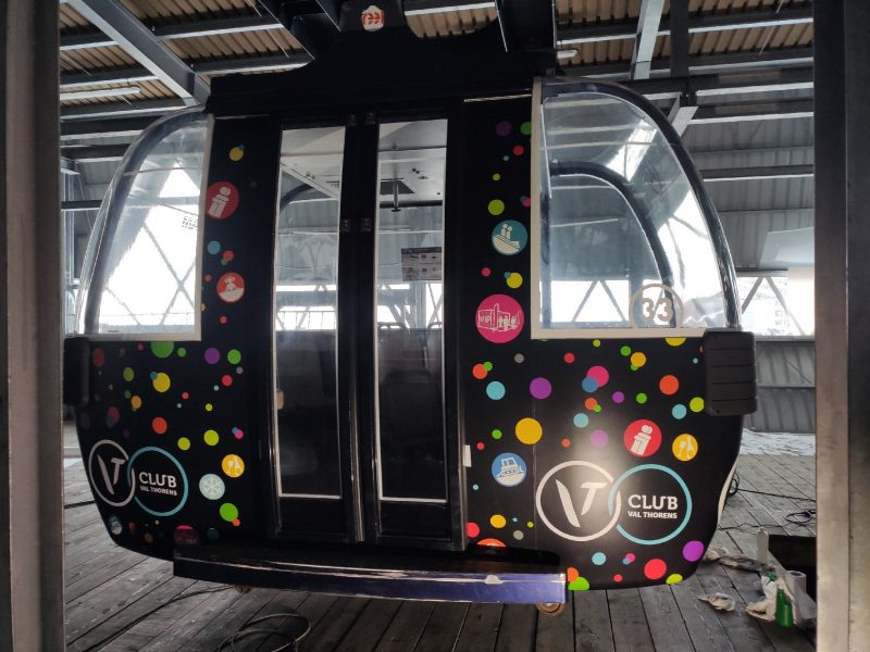 La station de Val Thorens nous a sollicité pour recouvrir une télécabine ainsi que la saleuse aux couleurs de la station.