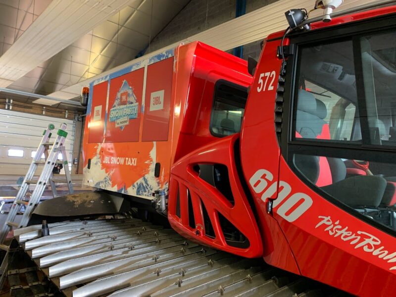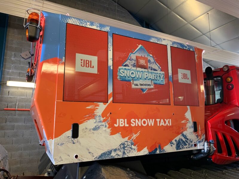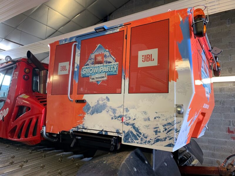 Dans le cadre de l’organisation de l’évènement JBL Snow Party, Val Thorens, la plus haute station de ski d’Europe nous a confié la réalisation d’un projet particulier : le covering d’une cabine de dameuse.